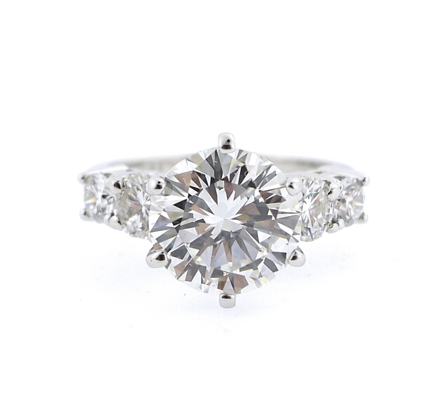 A true classic with larger shared prong diamonds on the side makes for a true statement ring. 4 oval diamonds total .47 carats. Price does not include center diamond. In stock for a 1.25 - 1.50 carat round center, this custom made mounting can also be made to fit your existing diamond, or the perfect one we can source for you. Please call 215-493-6100 for pricing and information. Can be designed in white or yellow gold and in platinum as shown.