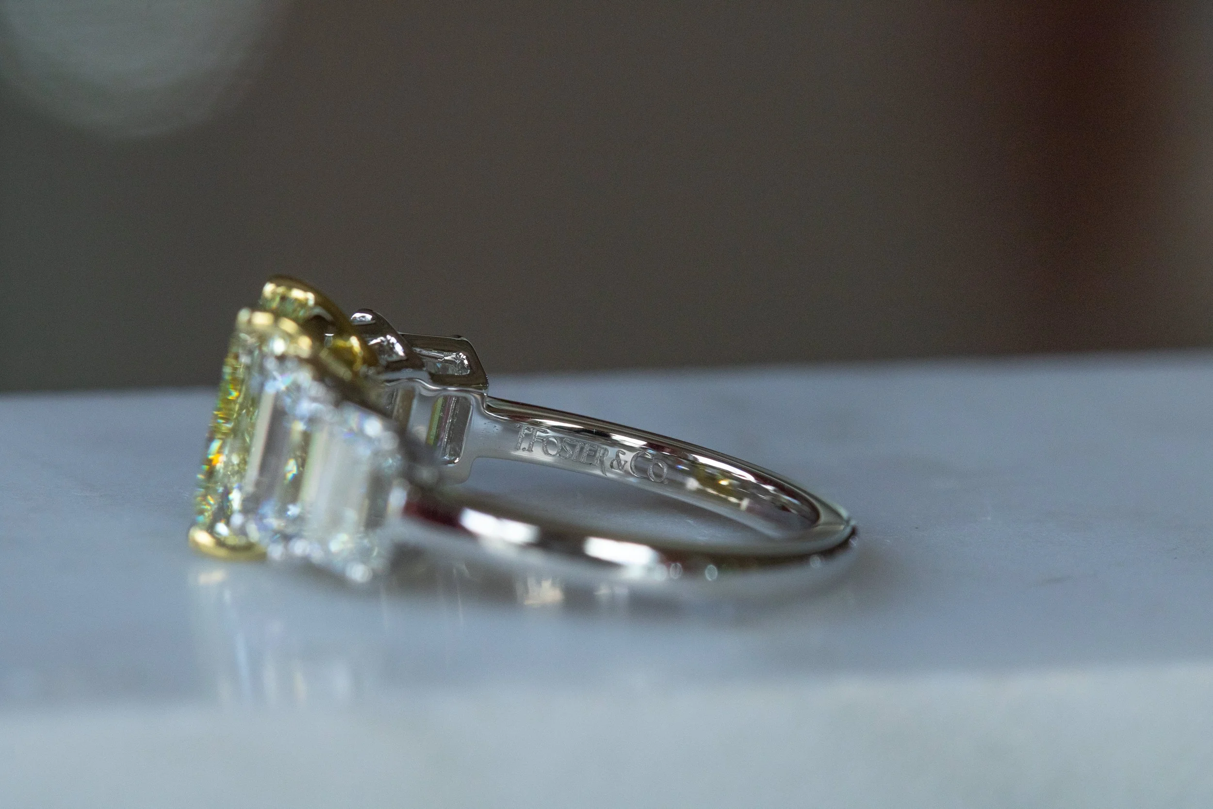 Metals: 18K yellow gold prongs; platinum setting and shank