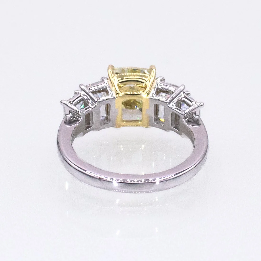 A dazzling one-of-a-kind ring featuring a rare 3.02 ct fancy yellow square diamond set in 18K yellow gold prongs. The central stone is beautifully framed by 22 round brilliant-cut yellow diamonds totaling 0.30 ct, creating a rich, warm halo. An outer halo of 43 round brilliant white diamonds (1.00 ct) surrounds the yellow cluster and continues down both sides of the elegant split shank for extra sparkle and balance. The contrast of yellow gold prongs and vivid yellow diamonds against the platinum setting creates striking depth and luxury.