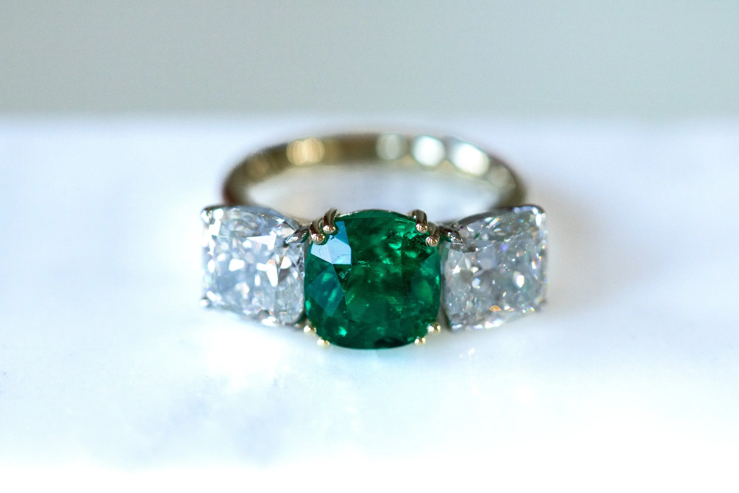 Our emerald and diamond ring is crafted in luxurious 18K white gold. This stunning piece features two square emeralds, radiating vibrant green hues. The emeralds are elegantly complemented by diamonds in oval, round, and baguette cuts, offering a harmonious blend of brilliance and sophistication. This ring is a perfect statement piece for any occasion, capturing attention with its dazzling contrast and timeless elegance. Embrace the allure of fine jewelry with this captivating design that celebrates both the richness of emeralds and the sparkle of diamonds.
