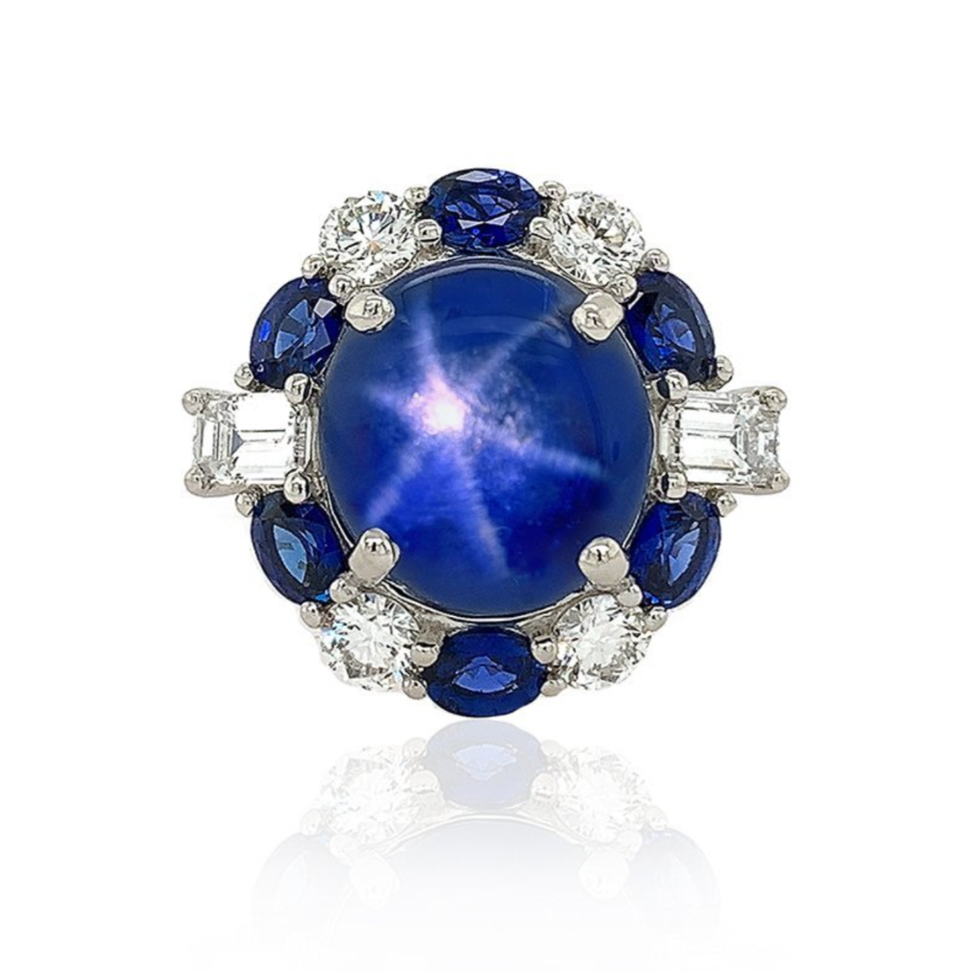 This platinum ring showcases a 2.52-carat deep blue cushion-cut Madagascar sapphire, flanked by a pair of trillion-cut sapphires and accented with 12 round diamonds totaling 0.80 carats. GIA Certificate included.